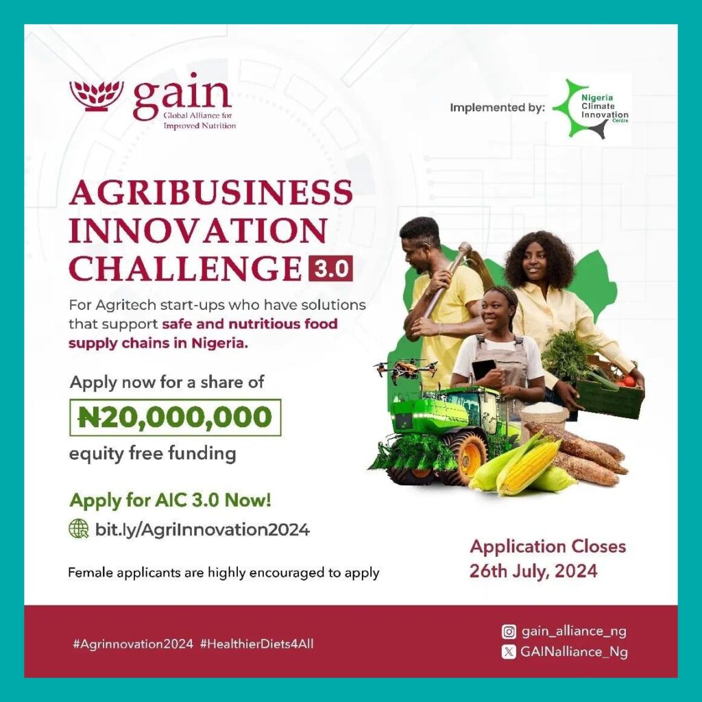 The Agribusiness Innovation Challenge is organised by the Global Alliance for Improved Nutrition – GAIN) – a Non-Governmental Organisation (NGO) driven by a vision of a world without malnutrition, in which all people have access to and consume nutritious and safe food.