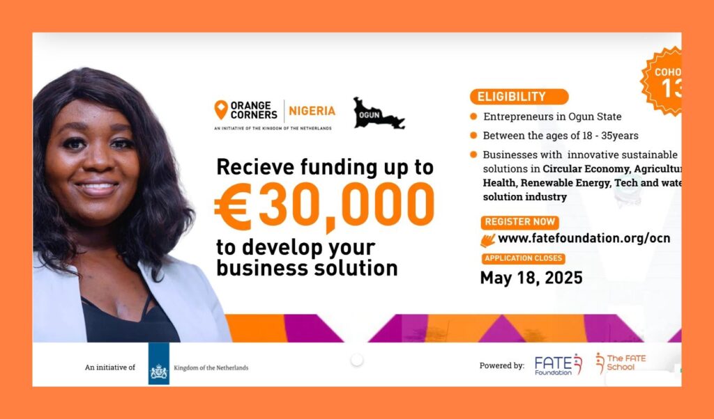 The May 18, 2025 deadline is approaching for applying to the Orange Corners Nigeria Incubation Programme—a proud partnership between the Kingdom of the Netherlands and FATE Foundation. This is the 13th cohort and the 2nd Cohort in Ogun State!