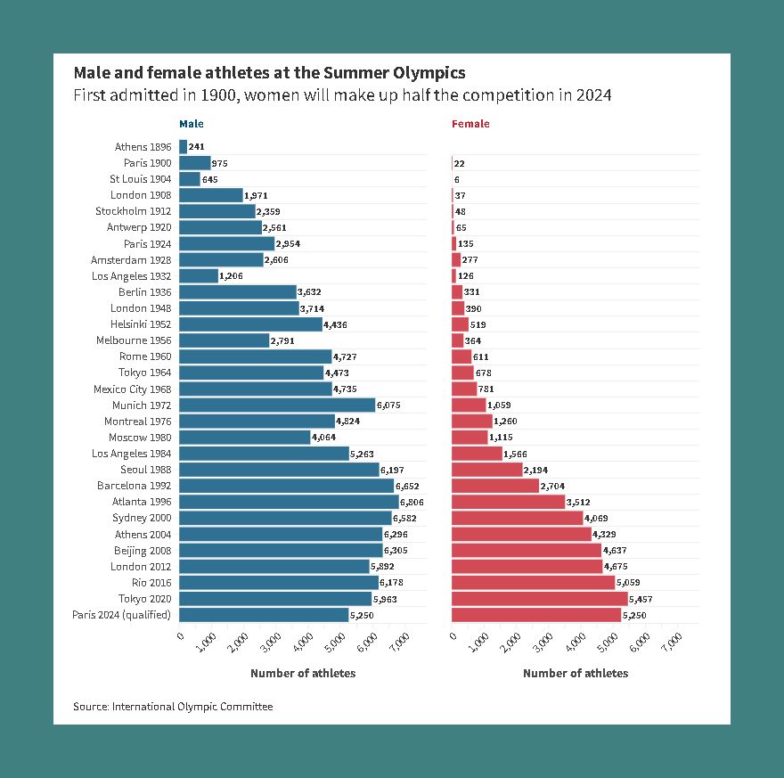 The equal allocation of 10,500 qualifying spots – a far cry from the first Paris Games, in 1900, when there were 22 female athletes – is a point of pride for organisers. It is also the latest milestone in the growth of women’s sport around the world.